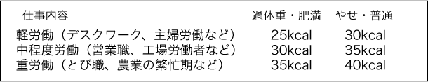 あなたの体重1kgあたりに必要なエネルギー量を調べましょう。(キロカロリー:kcal)